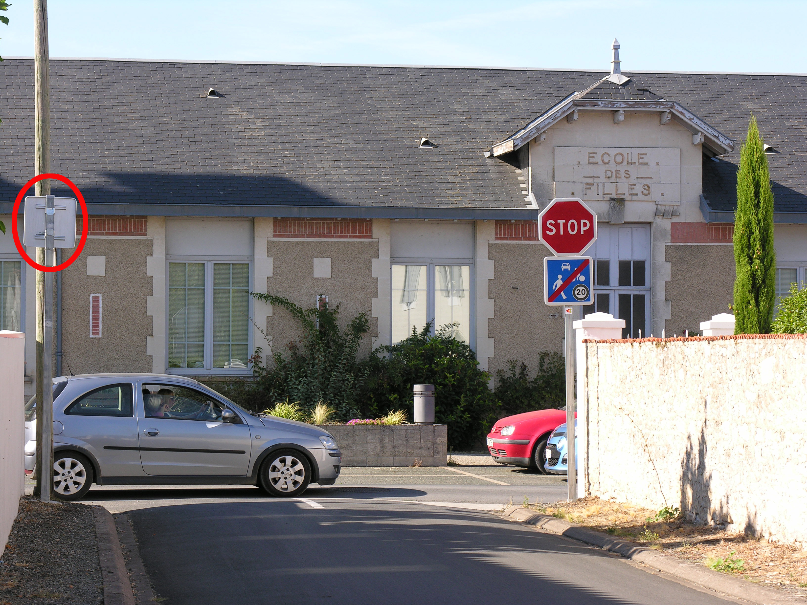 Deux aberrations à ce carrefour : le panneau d’entrée est dissimulé derrière un poteau type télégraphique ; le panneau « stop » doit être seul sur son poteau selon la sécurité routière.