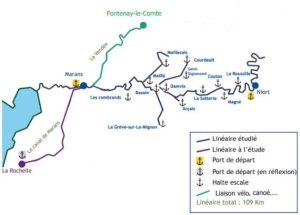 Des points d’accostage, appelés haltes-escales, sont prévus sur la Sèvre Niortaise à La-Roussille, Magné, Coulon, La-Sotterie, Le-Mazeau, Damvix, Maillé, Bazoin, les Combrands de Taugon et Marans ; sur le Bief de La-Garenne au port d’Arçais. A partir des écluses de Bazoin, deux canaux sont navigables : le Canal de la Vieille Autize qui remonte vers les haltes de Saint-Sigismond et Courdault. Une ramification est prévue jusqu’à Maillezais par le Canal de la Jeune Autize ; A l’opposé, le Canal du Mignon qui descend jusqu’à Mauzé-sur-Le-Mignon via une halte à La-Grève-sur-Le-Mignon. Une borne de service est prévue sur chaque halte-escale munie de prises électriques 360 volts.