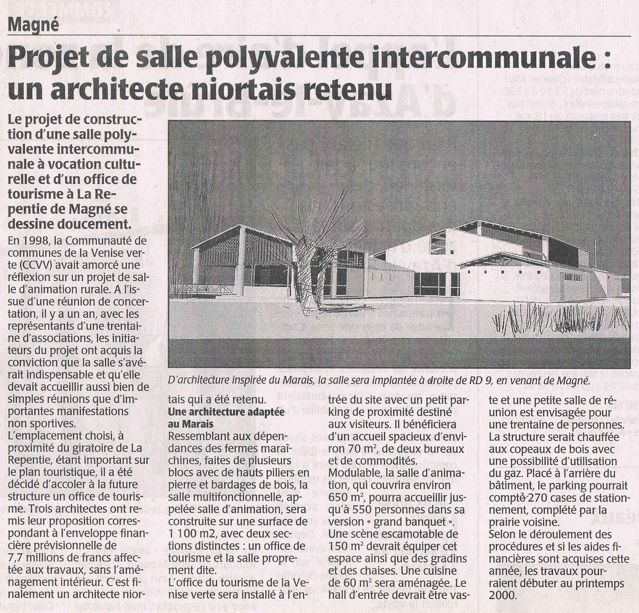 Rédigé par Gilles Petit, le Courrier de l’Ouest des Deux-Sèvres a rendu public, le 3 mars 2000, le grand projet de la Communauté de Communes de la Venise Verte, la construction d’une vraie salle polyvalente associée au tourisme. Documentation Gilles PETIT