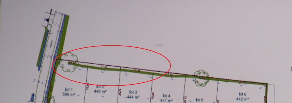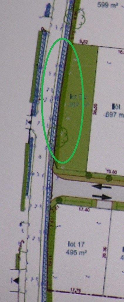 Concernant le problème de la gestion des eaux pluviales, le sujet a déchaîné les passions dans la salle des fêtes de Coulon. Le chargé d’étude de « Un Terrain Pour Demain » a réussi à expliquer que pour un aménagement spécifique, « nous allons enlever une partie de haie existante (ci-contre, cerclée en vert), puis la replanter, pour faire les travaux d’aménagement de gestion des eaux pluviales. Une zone de stockage pour éviter de mettre l’eau dans la rue. On va créer un petit talus de 50 cm pour retenir du volume supplémentaire. On remonte un peu le niveau, ce qui nous permet de créer ce volume. »
