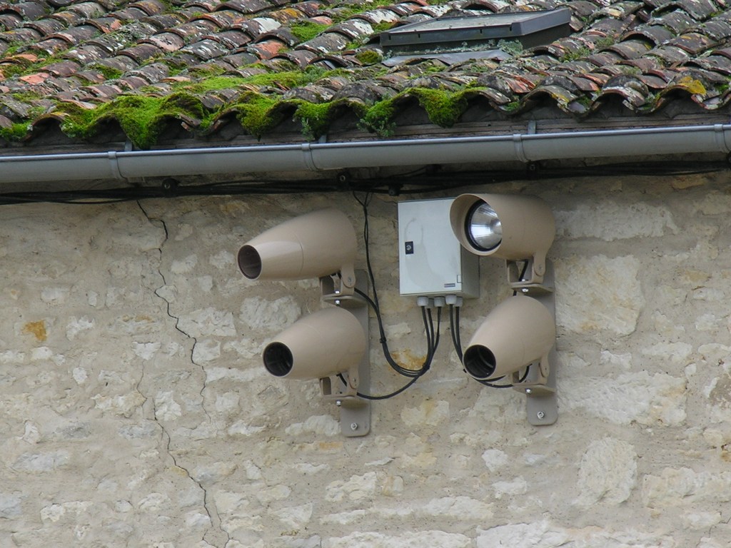 De nombreux puissants projecteurs sont nécessaires pour réaliser la « mise en lumière » du centre-bourg. Les économies d’électricité réalisées par ailleurs dans l’année risquent d’être englouties, en deux mois, par des images projetées sur des façades. Passé l’attrait de la nouveauté, les habitants se lasseront vite de ce décor inapproprié. Photo Gilles Petit
